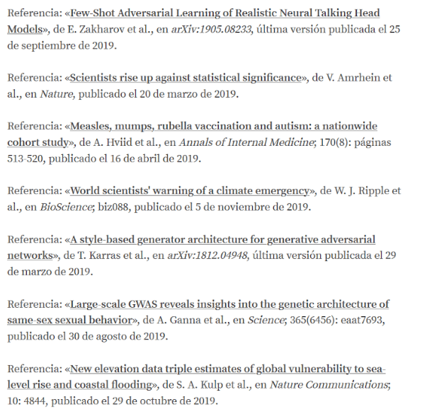 Fals, com podeu veure en la imatge següent on surten els deu articles amb més impacte (és el paràmetre amb què es mesuren les investigacions amb més importància en l’àmbit acadèmic de la ciència) del 2019, tots ells firmats per homes.