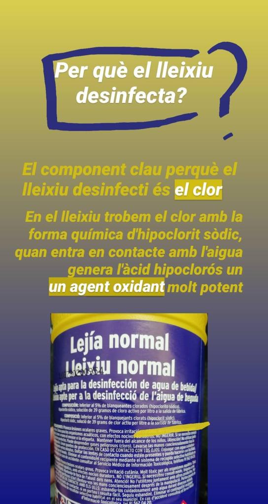 A les estanteries del safareig també tenim altres productes desinfectants que contribueixen a la neteja com el lleixiu. En aquest cas, el component clau perquè el lleixiu desinfecti és el clor amb la forma química d’hipoclorit sòdic. Quan aquest entra en contacte amb l’aigua genera l’àcid hipoclorós un agent oxidant molt potent, una molècula molt inestable que tendeix a captar electrons d’altres molècules. Que un element robi electrons a un altre provoca canvis en l’estructura de les molècules cosa que les inhabilitarà. Posem un exemple, si els electrons fossin claus i cargols d’una cadira si desapareguessin la cadira perdria la seva funció perquè la seva estructura no será estable i es desmontaria. Aquest procés s’anomena desnaturalització de les proteïnes i el lleixiu el produeix en molècules clau per la vida cosa que dificulta la supervivència de microorganismes i de les nostres cèl·lules.