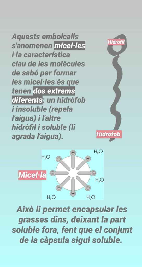 El sabó és una sal soluble en aigua que permet netejar molècules insolubles en l’aigua, com la grassa, creant càpsules esfèriques per amagar les grasses a dins i fer que el conjunt sigui soluble. La característica clau de les molècules de sabó per formar aquests embolcalls és tenir dos extrems diferents: una punta és hidròfoba i insoluble (li agrada la grassa però no l’aigua) i l’altra punta és hidròfila i soluble (li agrada l’aigua però no les grasses). Quan les molècules de sabó troben una grassa s’organitzen al voltant d’ella situant l’extrem hidròfob a la grassa i l’hidròfil a l’aigua formant la càpsula anomenada micel·la. Aquesta micel·la és capaç de viatjar de forma soluble en l’aigua.